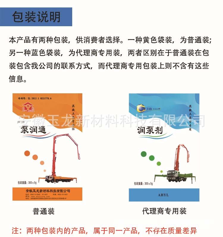 泵車潤管劑(泵潤通)產(chǎn)品使用了可降解彩色復(fù)膜包裝,包裝規(guī)格:50袋/箱,300克/袋。本產(chǎn)品應(yīng)儲存于防曬、通風、干燥處,保質(zhì)期:三年。