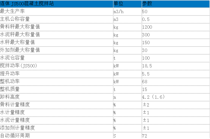 連體JS500混凝土攪拌站是由兩臺JS500強制式雙臥軸攪拌機、PLD800配料機、控制系統(tǒng)等部分組成的全自動攪拌站設備,同時配有單獨手動控制、落差自動補償、砂石含水率補償,能自動完成預定罐次生產(chǎn)。理論生產(chǎn)率50立方/小時,卸料高度為3.8米,儲料斗容積為4立方*3倉或4倉。
