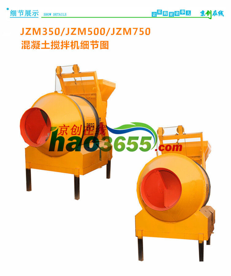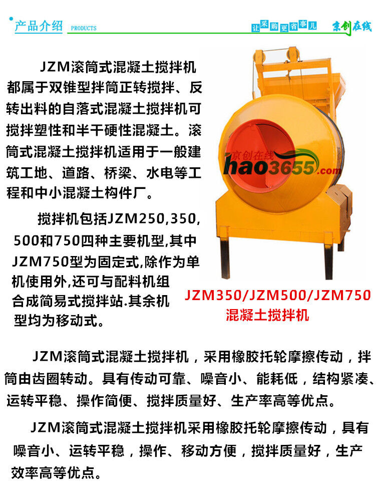 JZM350滾筒式混凝土攪拌機 ,是一種帶有葉片的軸在圓筒或槽中旋轉,將多種原料進行攪拌混合,使之成為一種混合物或適宜稠度的機器。 攪拌機分為好多種,有強制式攪拌機、單臥軸攪拌機、雙臥軸攪拌機等等。注意事項:攪拌機及自動供料機,必須把里面清洗干凈,尤其是冬天,這樣能延長壽命。攪拌機即是混合機,因為混合機的通常作用就是混合攪拌各類干粉砂漿,故俗稱攪拌機。攪拌機包括JZC250,350,500和750四種主要機型,其中JZC750型為固定式,除作為單機使用外,還可與配料機組合成簡易式攪拌站.其余機型均為移動式。
