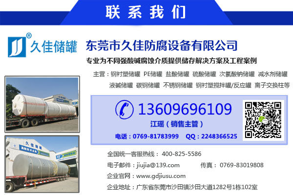 東莞久佳生產(chǎn):久塑牌(1-125m3)立/臥式鋼襯塑(PE/PO)/碳鋼/不銹鋼儲(chǔ)罐、(5-50m3)管口一體成型PE儲(chǔ)罐、鋼襯塑攪拌罐/反應(yīng)罐/過濾罐/中和罐、離子交換柱、鹽酸儲(chǔ)罐、硫酸儲(chǔ)罐、次氯酸鈉儲(chǔ)罐、液堿儲(chǔ)罐、硝酸儲(chǔ)罐、減水劑儲(chǔ)罐、化工儲(chǔ)罐、酸堿儲(chǔ)罐等防腐儲(chǔ)存容器設(shè)備;公司規(guī)模和產(chǎn)品質(zhì)量在國內(nèi)處于領(lǐng)先地位。