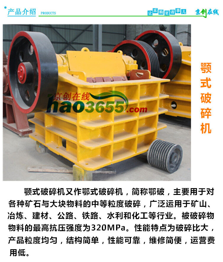 顎式破碎機在礦山、建材、基建等部門主要用作粗碎機和中碎機。按照進料口寬度大小來分為大、中、小型三種,進料口寬度大于600MM的為大型機器,進料口寬度在300-600MM的為中型機,進料口寬度小于300MM的為小型機。顎式破碎機結(jié)構(gòu)簡單,制造容易,工作可靠,使用維修方便。