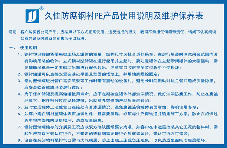 氫氟酸儲罐材質(zhì)  廣東鋼襯PE氫氟酸儲罐廠家 久佳牌 訂制 鋼襯塑酸堿儲存罐特性:鋼襯塑儲罐由于其獨特的滾塑工藝、產(chǎn)品整體結(jié)構(gòu)和材料優(yōu)異性能,具有整體性好、強度高、無焊縫、不滲漏、抗沖擊、韌性好、重量輕、壽命長、耐酸堿、耐有機溶媒、符合衛(wèi)生標準、價格低廉、規(guī)格品種多等特點。尤其耐腐蝕、長壽命和大規(guī)格品種有非常大的優(yōu)勢,是貯存和運輸各類化工液體半固體的理想產(chǎn)品。其性能大大超過了傳統(tǒng)的玻璃鋼、陶瓷、橡膠、焊接塑料等材料制作的防腐儲罐。已成為傳統(tǒng)防腐儲罐的升級換代產(chǎn)品,逐漸成為防腐儲罐的首選產(chǎn)品。