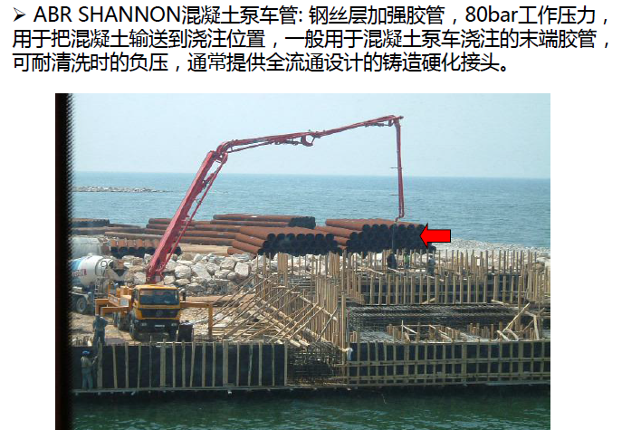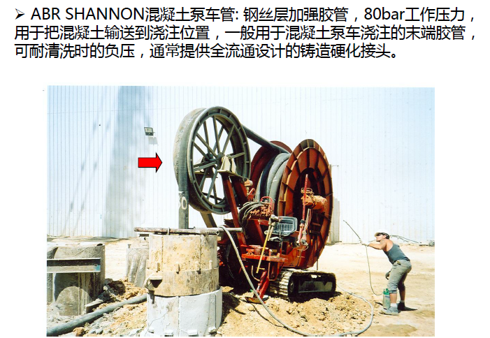 應(yīng)用范圍: 鋼絲層加強(qiáng)膠管,85bar 工作壓力,用于把混凝土輸送到 澆注位置;一般用于混凝土泵車澆筑的末端膠管,管子可以耐清 洗時(shí)的負(fù)壓,通常提供全流通設(shè)計(jì)的鍛造硬化接頭