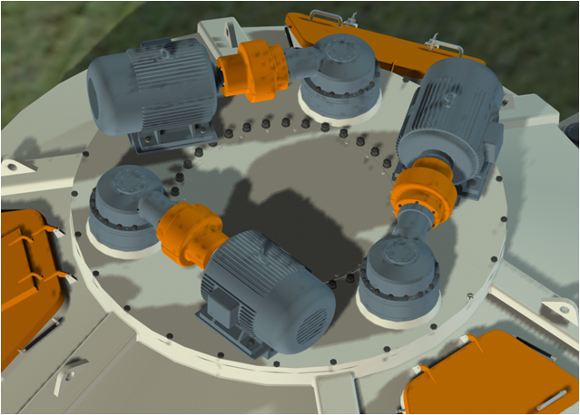 ④對(duì)于大型立軸行星式攪拌主機(jī),我們采用多電機(jī)驅(qū)動(dòng),其起動(dòng)平穩(wěn)、可靠性高。獨(dú)特的電機(jī)臥式安裝結(jié)構(gòu),有效降低了攪拌主機(jī)的整體高度,方便運(yùn)輸和安裝及攪拌主機(jī)進(jìn)料系統(tǒng)布局,維修更加簡(jiǎn)便,該主機(jī)結(jié)構(gòu)設(shè)計(jì)我公司已獲專利。