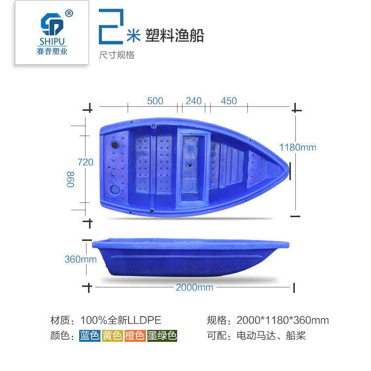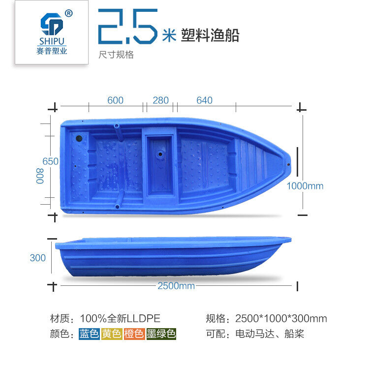 1.塑料漁船船體可裝電動馬達,可以配船槳,可配頂棚改裝為景觀船。