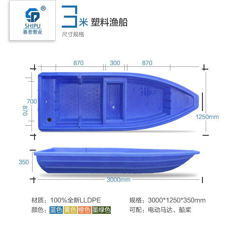3.本公司專業(yè)生產(chǎn)的塑料漁船,是為水產(chǎn)養(yǎng)殖戶量身定做的,采用進口韓國LLDPE材質,具有很強的抗老化性,保證船的使用壽命在20年以上。一次成型,無縫焊接。顏色可改。船身都是雙層的質量更好浮力更大 目前所有的塑料船都打上了泡沫。