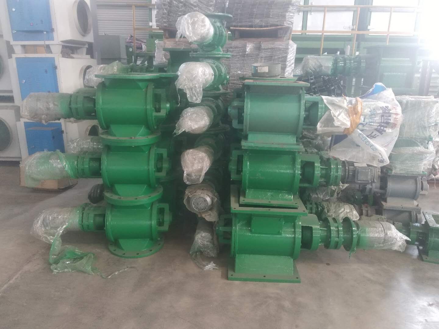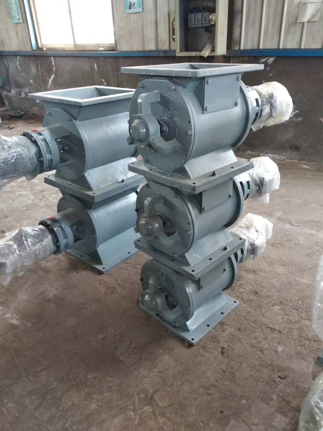 工作原理:星型卸料器工作時,粉塵靠重力落入,充滿上面和側(cè)面的星形葉片空格。葉片轉(zhuǎn)子由電動機通過減速機轉(zhuǎn)動軸帶動,葉輪轉(zhuǎn)到下部粉塵靠自重卸下。這種卸塵器一般都安裝在除塵器灰斗下部,為保證連接處的嚴密不漏風,在回轉(zhuǎn)卸料器的上部應(yīng)經(jīng)常保持(儲存)一定高度的粉塵。因為葉輪轉(zhuǎn)動時,卸完粉塵后葉輪轉(zhuǎn)上的那一面經(jīng)常是沒有粉塵的,所以容易使空氣漏入。為了保持一定高度的灰柱,而且不致卸空,*在灰斗內(nèi)裝設(shè)料位信號設(shè)施,并與卸塵閥的電動機建立連鎖。