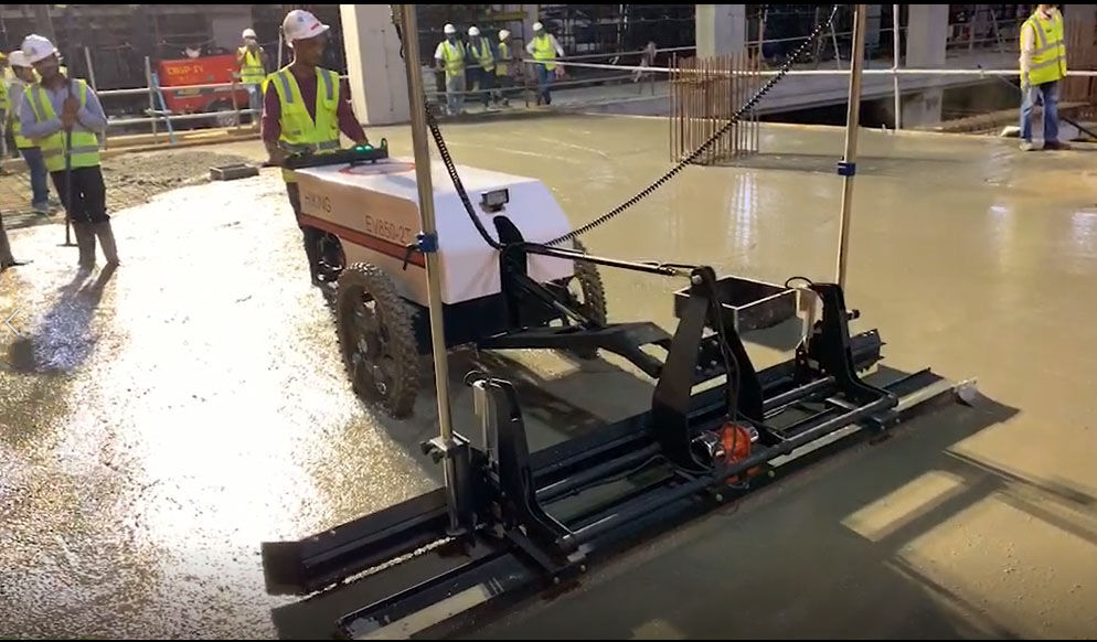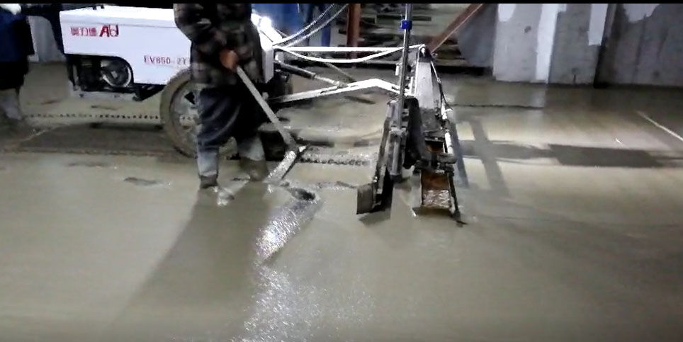 混凝土激光攤鋪機是用刮板將高出的混凝土帶走并初步刮平,達到設(shè)計要求的標(biāo)高。液壓驅(qū)動振動馬達產(chǎn)生震動,頻率為4000次/分鐘,帶動整個振動板一起對混凝土產(chǎn)生振搗。激光攤鋪機找平不需要拉控制線,也不需要支側(cè)模板來控制地面標(biāo)高,而由攤鋪機上的激光測控系統(tǒng)實時控制,只要激光發(fā)射器不受干擾,無論攤鋪機移動到哪里,都能確保鋪筑后的地面整體上的標(biāo)高不受影響。