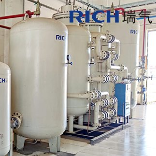 瑞氣所生產(chǎn)的制氮機(jī)采用變壓吸附技術(shù),以空氣為原料制取氮?dú)?。變壓吸附制氮技術(shù),一般采用PSA碳分子篩為吸附劑,碳分子篩對氧氮的吸附速度相差很大,在短時(shí)間內(nèi)加壓情況下,氧的吸附速度大大超過氮的吸附速度,氧分子被碳分子篩大量吸附,而氮分子吸附很少,利用該特性來完成氧氮分離。碳分子篩對氧的吸附容量隨壓力的降低而減少,減低壓力,被吸附的氧分子則從碳分子篩中逸出,通過塔的下部進(jìn)入消音器后排出大氣,即可解吸,完成碳分子篩的再生。另外,碳分子篩對二氧化碳和水分也有吸附能力,且較易減壓解吸。通常PSA制氮機(jī)采用雙吸附并聯(lián)交替進(jìn)行吸附產(chǎn)氮,解吸再生,實(shí)現(xiàn)氧、氮分離,連續(xù)供氣。