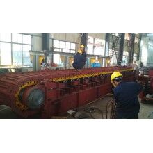 槽板為圓弧搭接式(OK板),采用低合金鋼板組焊而成,強度高、耐磨損、不漏料,輸送槽底板厚度≥16-25mm、此板沖壓成型,在槽板上下增加了80-120mm加強筋,提高了整體的剛度、強度及耐磨性,延長使用壽命。槽板互相搭接,工作時不漏料,槽板上下加強,具有更大的承載能力;