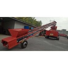 新型履帶移動(dòng)式堆料機(jī),以皮帶輸送機(jī)的物料輸送功能為主體,皮帶輸送機(jī)的兩端分別設(shè)置有傳統(tǒng)的入料裝置和出料裝置。其特征在于,還包括履帶底盤(pán)和行走輪,皮帶輸送機(jī)的一端通過(guò)轉(zhuǎn)盤(pán)機(jī)構(gòu)與履帶底盤(pán)連接,皮帶輸送機(jī)的另一端通過(guò)鉸接機(jī)構(gòu)與行走輪連接,整個(gè)裝置由液壓馬達(dá)驅(qū)動(dòng)履帶行走,動(dòng)力可采用柴油發(fā)動(dòng)機(jī)或外接電源。