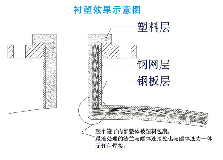 鋼襯塑聚乙烯儲(chǔ)罐:以純聚乙烯(PE)為原料,使用熱融滾塑工藝將聚乙烯內(nèi)襯于鋼罐體內(nèi)壁,鋼罐體內(nèi)網(wǎng)(龜甲)與聚乙烯有機(jī)結(jié)合成一體,使聚乙烯牢固過渡連接鋼體內(nèi)表面,內(nèi)襯聚乙烯防腐層厚度可根據(jù)實(shí)際需要而定,內(nèi)襯聚乙烯防腐層厚度可在15-25mm不等。