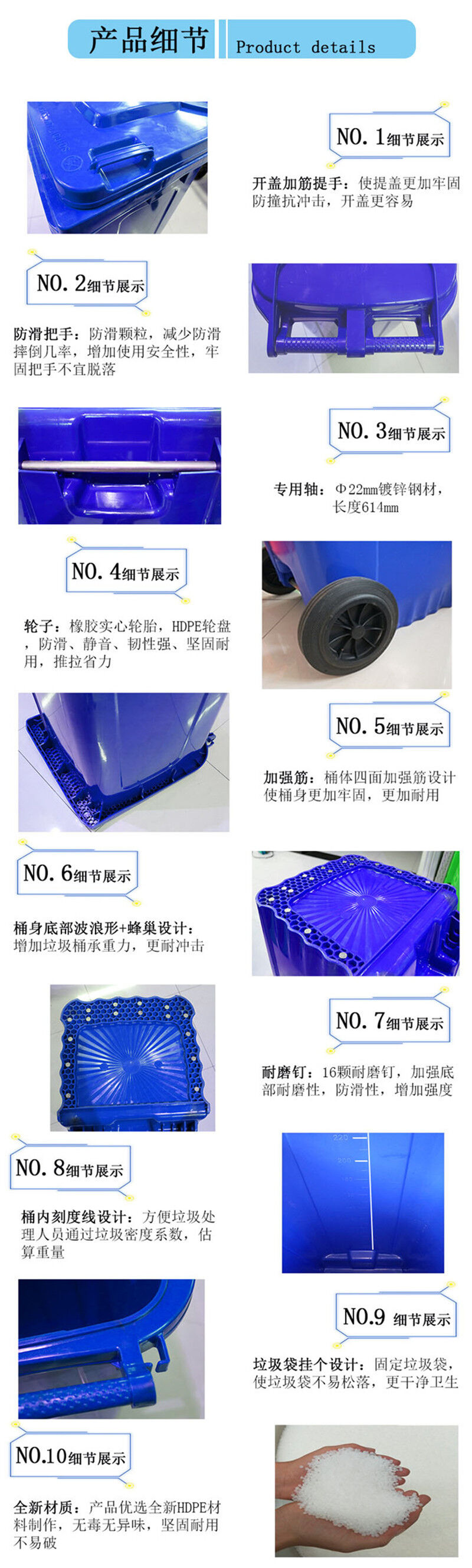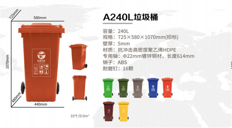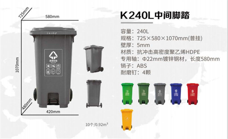 240L塑料垃圾桶/塑料環(huán)衛(wèi)垃圾桶,桶蓋密合,可防止異味散發(fā),雨水侵入,蚊蠅滋生,桶身可相互套疊,方便運輸,節(jié)省儲運空間與費用,桶內外表面光潔,便于倒空垃圾與清洗,垃圾桶設計符合 人體工程學,輕便耐用,移動靈活。產品賣點。240L塑料垃圾桶價格不浪費,讓城市更美觀少占地:生活垃圾中有些物質不易降解,使土地受到嚴重侵蝕。垃圾分類,去掉能回收的,不易降解的物質,減少垃圾數(shù)量達50%以上。少環(huán)境污染:廢棄的電池含有金屬。約資源鎘等有害的物質。
