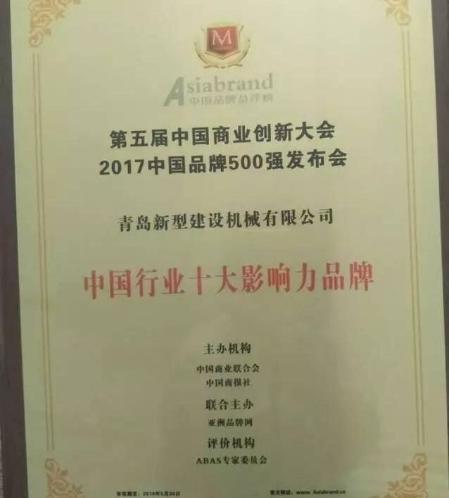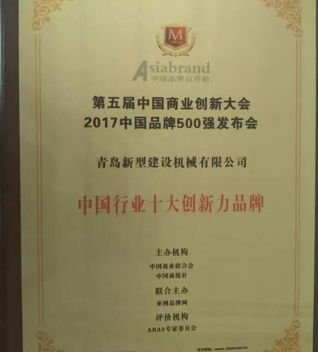 2017年5月31日,以“新品牌、新供給、新未來”為主題的第五屆中國商業(yè)創(chuàng)新大會暨2017中國品牌500強(qiáng)發(fā)布會在北京國家會議中心隆重舉行。建筑機(jī)械行業(yè)知名企業(yè)中青林集團(tuán)旗下青島新型建設(shè)機(jī)械有限公司受邀參會,一舉榮獲“中國行業(yè)十大創(chuàng)新力品牌”與“中國行業(yè)十大影響力品牌”。