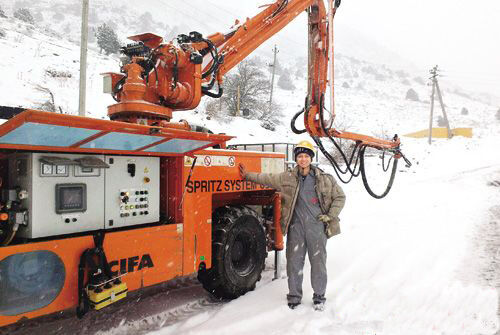 易穎志趕到工地后,發(fā)現(xiàn)設(shè)備油漆刮擦嚴(yán)重,許多部位變形,與客戶協(xié)調(diào)后,易穎志便開始檢測和開機(jī)調(diào)試。烏茲別克斯坦氣溫很低,夜間最低溫度達(dá)到了零下20多度,幾臺設(shè)備都在冰天雪地里,為保證設(shè)備盡快能使用,易穎志抵抗著極寒天氣在隧道外檢測,做各種調(diào)試。由于設(shè)備發(fā)生過碰撞,機(jī)械變形問題較多,易穎志擔(dān)心設(shè)備漏油,所以對每個(gè)有可能漏油的地方,他都會(huì)鉆到車底細(xì)心檢查,隨后再檢查設(shè)備的各項(xiàng)動(dòng)作和功能是否正常。他自己檢測一遍后,再教工地上的當(dāng)?shù)貦C(jī)手如何使用設(shè)備、保養(yǎng)設(shè)備,并開機(jī)試料,及時(shí)給出配比意見。