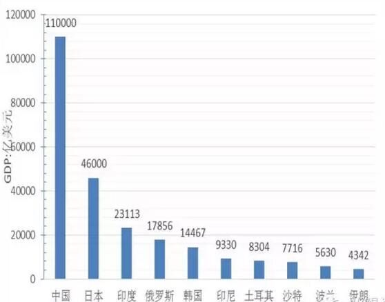 從經濟總量看,GDP超過1萬億美元的國家5個,分別為中國、日本、印度、俄羅斯、韓國,其中中國經濟總量為11萬億美元、位居第一、為最小國家不丹的5800倍,約占“一帶一路”地區(qū)經濟總量的40%;GDP在5000億到1萬美元的國家4個,分別是印尼、土耳其、沙特、波蘭;GDP在1000億到5000億美元的國家19個,GDP在100億到1000億美元的國家30個;低于100億元美元的國家8個,分別為塔吉克斯坦、蒙古、吉爾吉斯坦、摩爾多瓦、巴勒斯坦、黑山、馬爾代夫、不丹,其中經濟規(guī)模最小為不丹、GDP為19億美元。