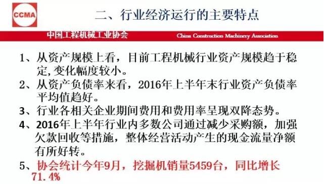 我個(gè)人總結(jié),今年的運(yùn)行情況有這樣十個(gè)方面。第一,從整個(gè)全行業(yè)各企業(yè)的資產(chǎn)規(guī)模上看,目前趨于穩(wěn)定,變化幅度很小,不像前兩年振動(dòng)那么大。第二,從資產(chǎn)負(fù)債率來(lái)說(shuō),現(xiàn)在負(fù)債率是在60%左右,全國(guó)的工業(yè)企業(yè)是56%。所以,這個(gè)行業(yè)的資產(chǎn)負(fù)債率目前看也是很好的。這個(gè)需要引起大家的關(guān)注和分析,我們也希望后幾個(gè)月情況可以穩(wěn)定向好。還有自主品牌市場(chǎng)占有率,在國(guó)內(nèi)市場(chǎng)還是保持高位,從全行業(yè)來(lái)看在90%以上。那么,產(chǎn)業(yè)的集中度又進(jìn)一步地增強(qiáng)了,但有一些企業(yè)挺無(wú)助的,出局了,進(jìn)口額下降。今年按照環(huán)保部5號(hào)令,全行業(yè)工程機(jī)械產(chǎn)品實(shí)現(xiàn)了新的標(biāo)準(zhǔn)升級(jí)。整個(gè)產(chǎn)品進(jìn)行了更新?lián)Q代,這個(gè)非常難能可貴。最后是產(chǎn)能結(jié)構(gòu)性過(guò)剩,有效需求不足問(wèn)題仍然突出,行業(yè)結(jié)構(gòu)調(diào)整還有供給側(cè)結(jié)構(gòu)改革遠(yuǎn)遠(yuǎn)沒(méi)有達(dá)到預(yù)期。即便是按照現(xiàn)在的挖掘機(jī)銷量5500多臺(tái),就算是6000臺(tái),產(chǎn)能又有多少?一旦市場(chǎng)回暖,一些企業(yè)家還是會(huì)頭腦一熱,這樣大一個(gè)產(chǎn)能釋放出來(lái)的產(chǎn)量是什么局面?我們必須保持一個(gè)清醒的頭腦。
